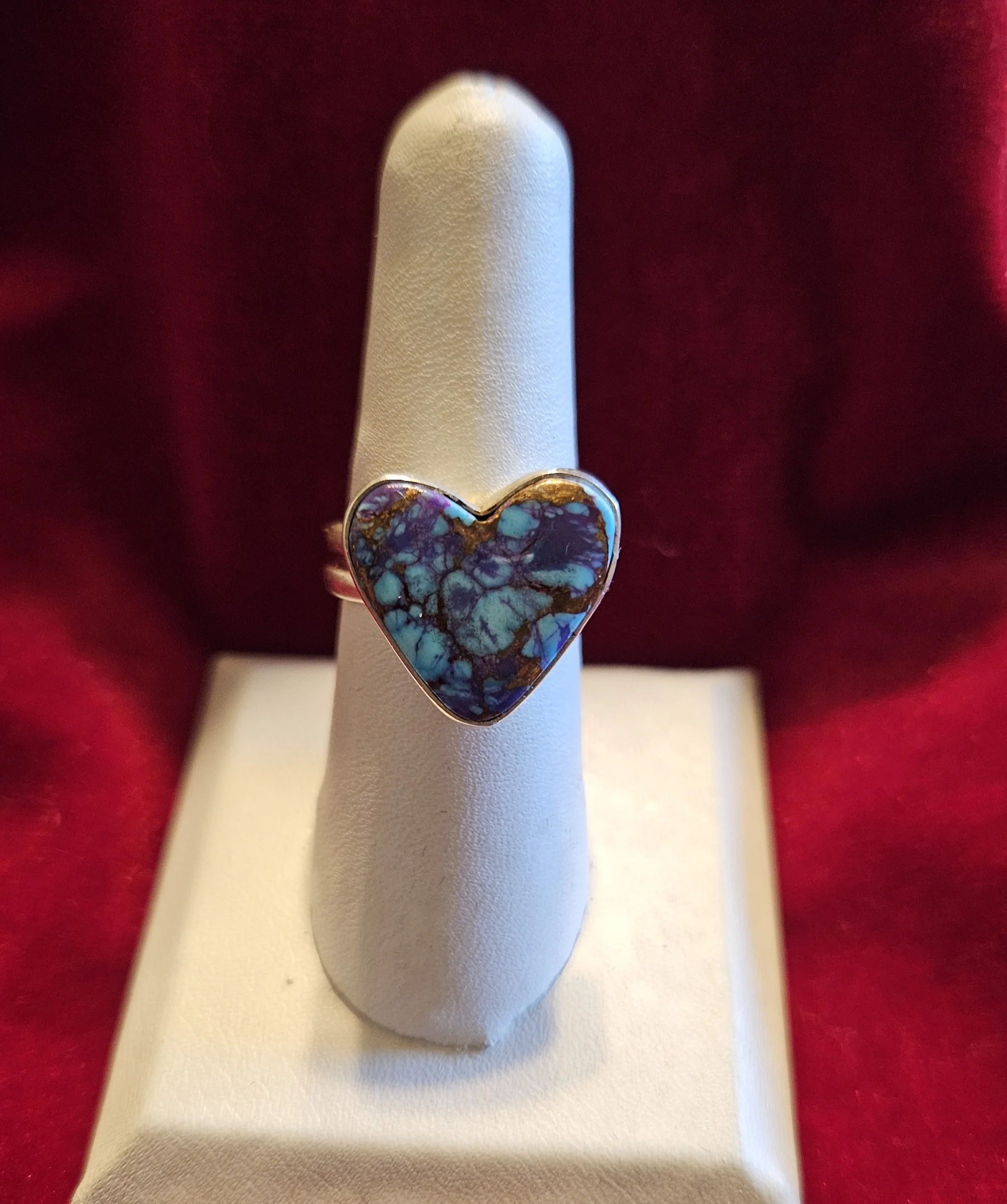 This beautiful ring features Mohave Blue Turquoise set in Sterling Silver. It measures approx 3/4” in length by 3/4” wide. It's made by local artisan Virgil Draper. It's a size 8